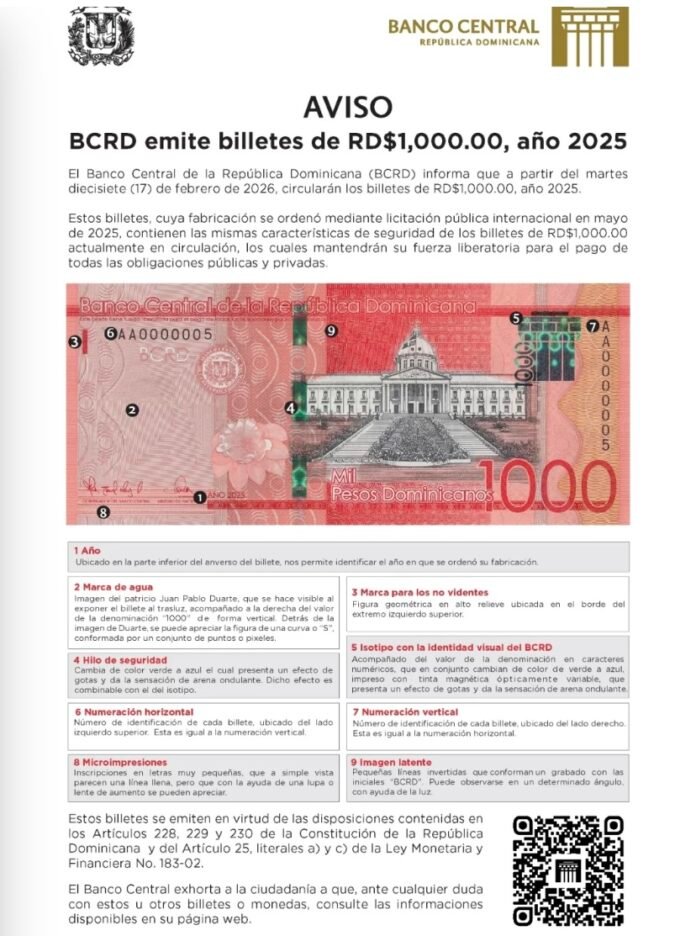 El Banco Central de la República Dominicana informa que a partir del martes 17 de febrero de 2026 comenzarán a circular los billetes de RD$1,000.00 correspondientes al año 2025.